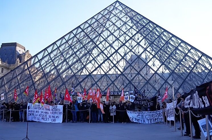 کارکنان با در دست داشتن پرچم، بنر و پلاکارد، ورودی مشهور هرم شیشهای «لوور» را مسدود کردند.